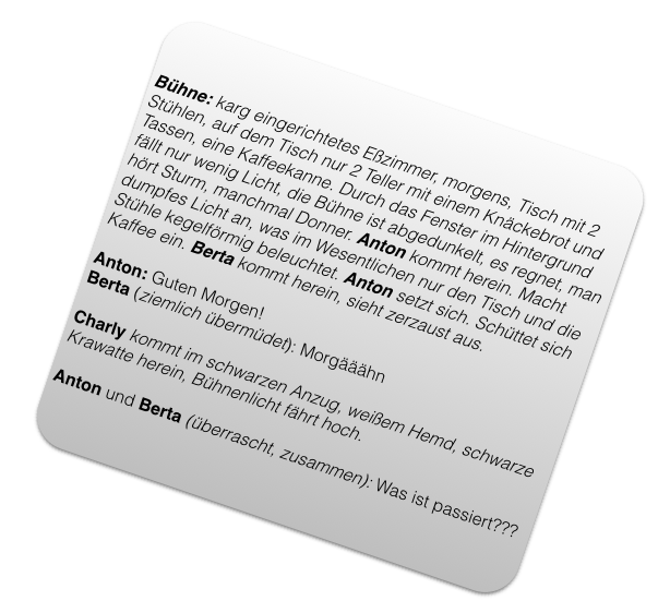 Wie Sie am Beispiel erkennen können, spielt das Textlernen ehrlich gesagt eine untergeordnete Rolle. Es geht viel mehr darum, die Rolle, den Charakter jedes Protagonisten (wie man im theaterdeutsch so schön sagt) herauszuarbeiten. Das wichtigste beim Theaterstück ist, was zwischen den Zeilen steht. Man hat es etwas leichter, wenn der Autor bereits ein Bild im Kopf hatte, das er notiert hat, wie im angedeuteten Beispiel.