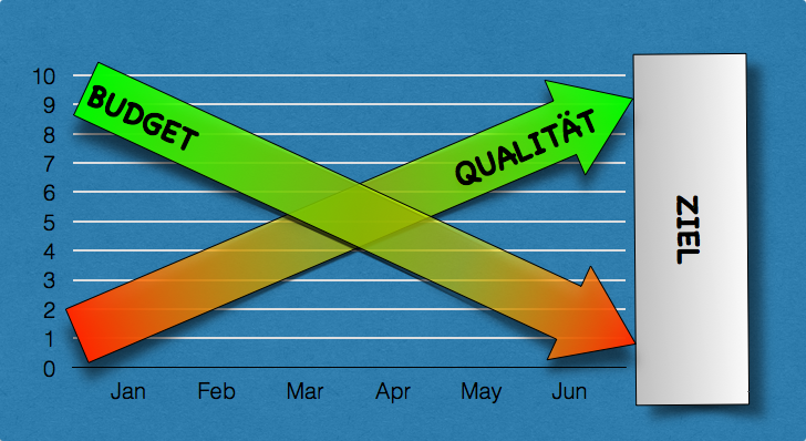 Und vergessen Sie nicht. Dies alles sind nur Beispiele, mit welchen Methoden Sie eine hohe Qualität in Ihren Projekten erreichen können. Die Beispiele – die Sie durchaus auf andere Projekte übertragen können – sollen zudem verdeutlichen, das Qualität mindestens genau so wichtig für erfolgreiche Projekte ist wie die Vollständigkeit der Projektdurchführung, die Termingenauigkeit und die Budgeteinhaltung. Und so schliesse ich den 1.Teil dieses Themas mit einer anschaulichen Grafik für die Abhängigkeiten der Zielsetzungen eines Projekts ab. Wie Sie bestimmt schon wissen: